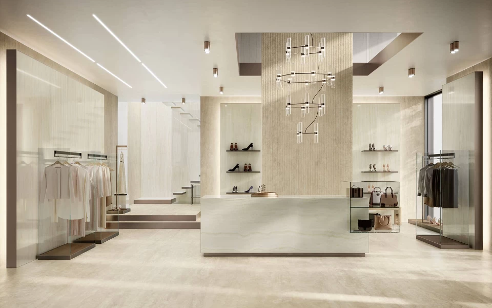 Shops, boutiques, offices… retail premises require professional solutions built to stand the test of time. Atlas Plan large format slabs in porcelain stoneware are the perfect match for any material, making it possible to create settings capable of standing out for their specific and recognizable identity.