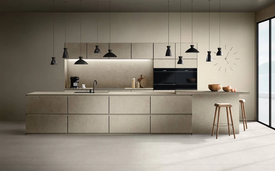 Atlas Plan offers a wide range of tiles in large sizes (162x324 cm, 160x320 cm, and 159x324 cm) with different thicknesses and finishes to furnish the kitchen with style and creativity. Atlas Plan porcelain slabs are NSF-certified food contact safe, essential for kitchens and tabletops.