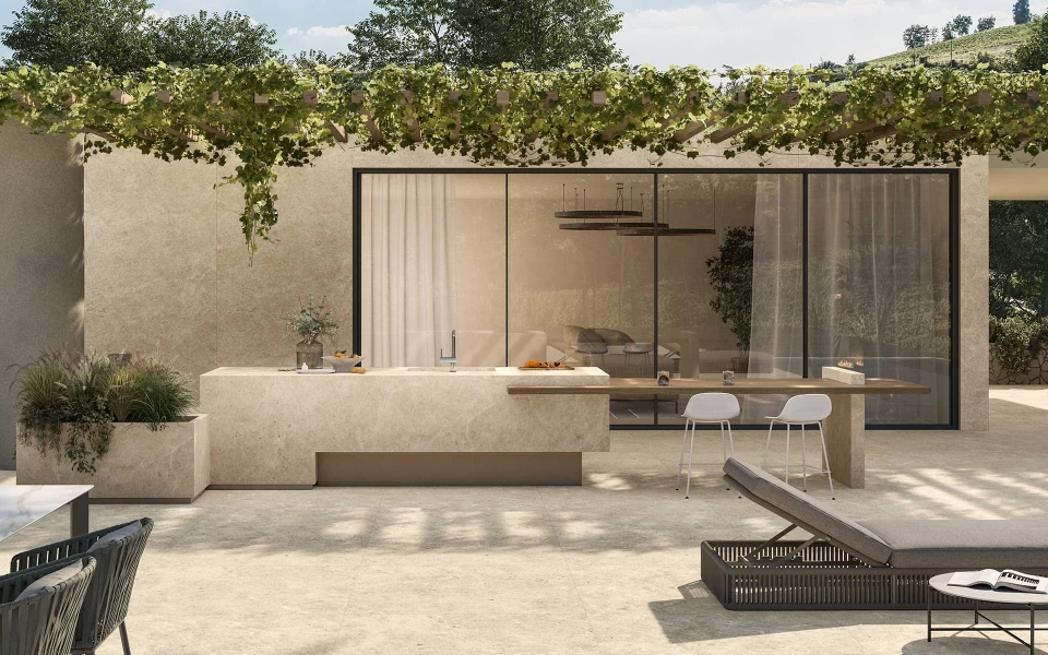 Atlas Plan slabs are ideal for cladding both indoor and outdoor areas such as outdoor kitchens, for those who have a garden, a courtyard, a terrace or a poolside area. Atlas Plan provides coverings that are ideal for application in outdoor kitchen environments; a unique selection for outdoor locations. Porcelain stoneware is a material that is perfectly suited to outdoor use, with excellent resistance to atmospheric agents and wear.